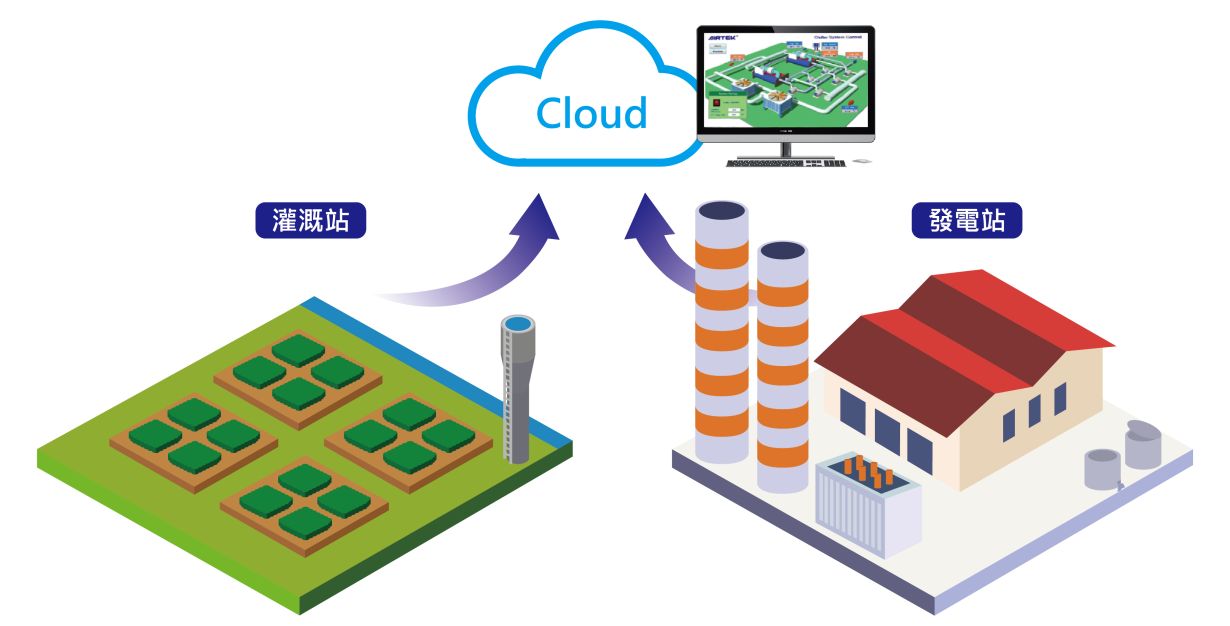 3. 大範圍、多個小型站點(發電站/灌溉站)應用,每個站點皆可雲端直接監控,並透過開放式的通訊協定整合至中央監控平台。